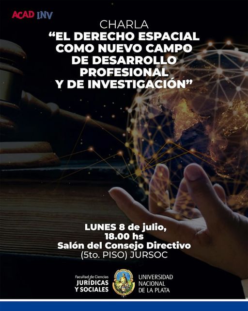 Desde la Secretaría de Investigación Científica, en coordinación con la Secretaría Académica de la Facultad de Ciencias Jurídicas y Sociales de la UNLP, invitamos a los/as docentes de esta Casa de Estudios a participar de la charla “El Derecho Espacial como nuevo campo de desarrollo profesional y de investigación”, la que se llevará a cabo el lunes 8 de julio a las 18.00 hs. en el salón del Consejo Drectivo, en el quinto piso de esta casa de estudios.