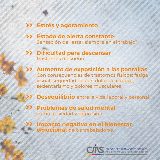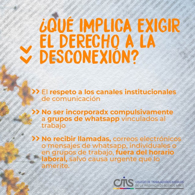 Recuperando las voces de colegas que en distintos espacios ocupacionales ven extendida arbitrariamente su jornada laboral, principalmente mediante el uso de medios digitales de comunicación, el CATSPBA se posiciona en la defensa del derecho a la desconexión como una forma de cuidado de nuestra salud y de respeto a nuestras condiciones de trabajo.