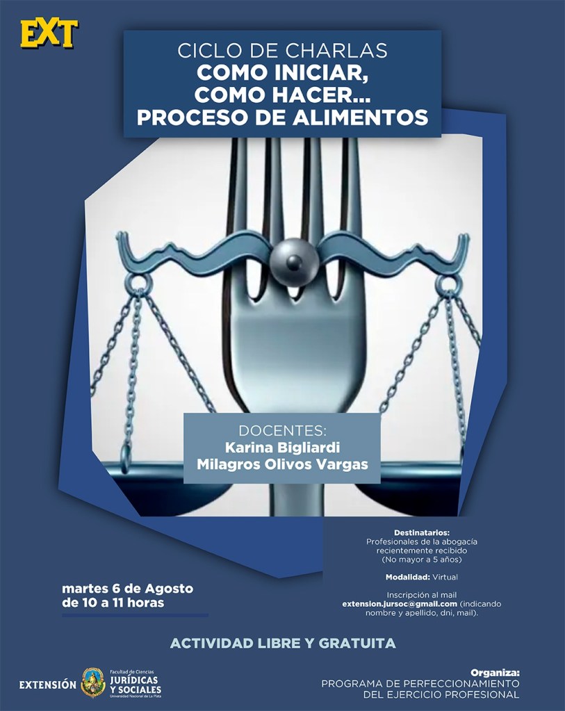 La Secretaria de Extensión Universitaria invita a participar del «CICLO DE CHARLAS COMO INICIAR, COMO HACER… PROCESO DE ALIMENTOS», organizado por el Programa de Perfeccionamiento Del Ejercicio Profesional dependiente de ésta Secretaría, el cual se llevará a cabo el día martes 6 de agosto de 10 a 11 hs, de manera virtual a través de la plataforma ZOOM.