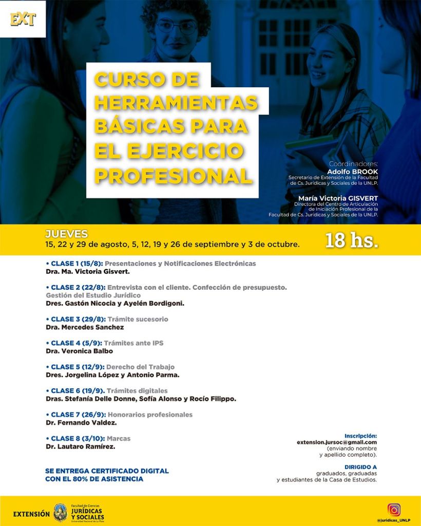 La Secretaria de Extensión Universitaria invita a participar del CURSO DE HERRAMINETAS BÁSICAS PARA EL EJERCICIO PROFESIONAL, organizado por el Centro de Articulación de Iniciación Profesional dependiente de esta Secretaría, el cual se llevará a cabo de manera presencial, los días jueves desde el 15 de agosto al 3 de octubre del corriente año a las 18 hs.