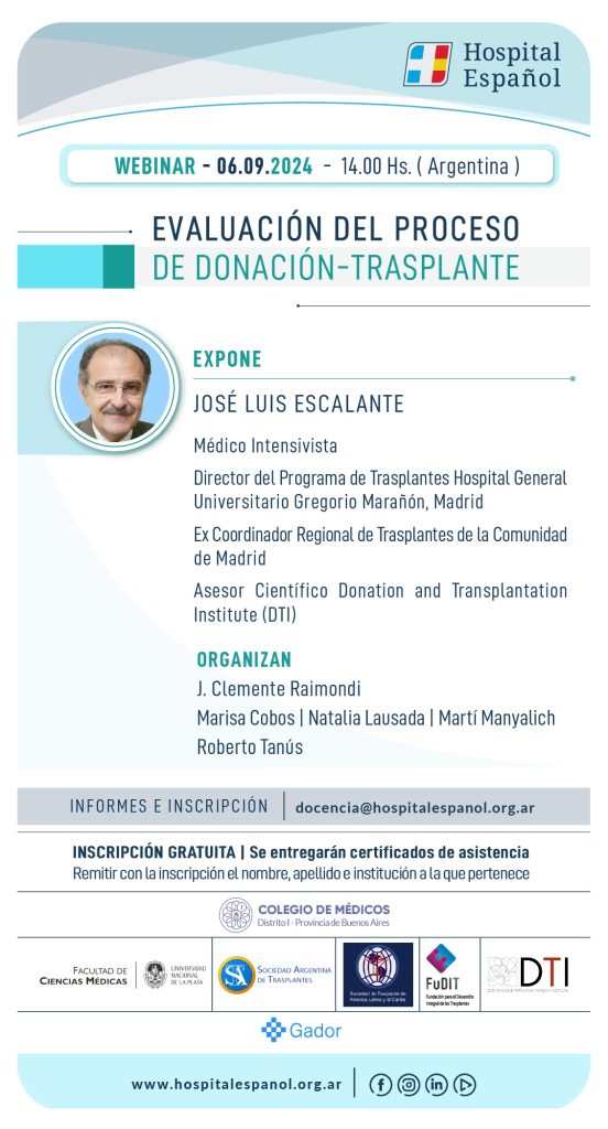 El Colegio de Médicos Distrito I informa que, en el marco de la Calificación Agregada de Procuración y Trasplante, el Hospital Español llevará a cabo un Webinar denominado “Evaluación del Proceso de Donación – Trasplante”, el próximo viernes 6 de septiembre a las 14 hs.