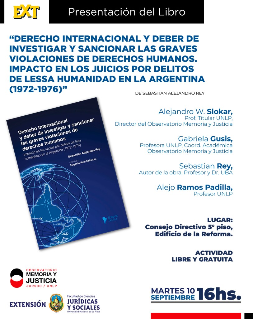 La Secretaría de Extensión Universitaria invita a participar de la Presentación del libro «Derecho Internacional y deber de investigar y sancionar las graves violaciones de Derechos Humanos. Impacto en los juicios por delitos de lesa humanidad en la Argentina (1972-1976)” del autor Sebastián Alejandro Rey.