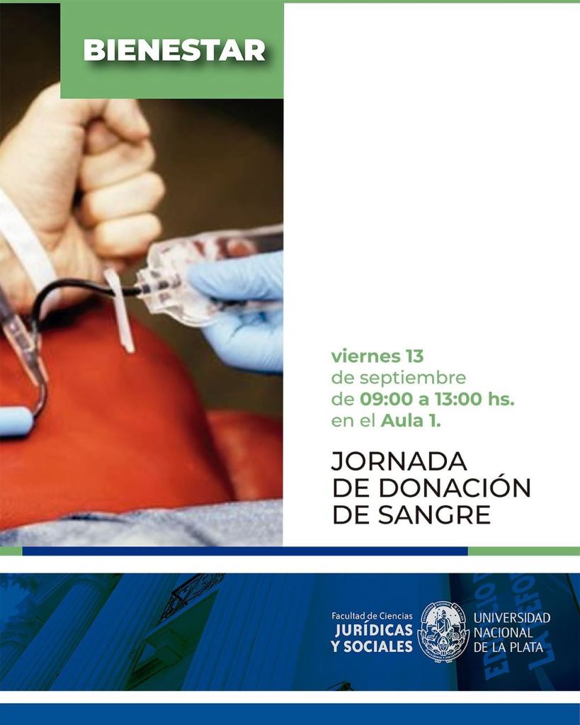 Desde la Secretaría de Bienestar Universitario junto al Centro Regional de La Plata del Instituto de Hemoterapia de la Provincia de Buenos Aires invitamos a toda la Comunidad Universitaria a una nueva Jornada de Donación de Sangre que se estará realizando en nuestra casa de estudios el día viernes 13 de septiembre de 09:00 Hs a 13:00 Hs en el aula 1.