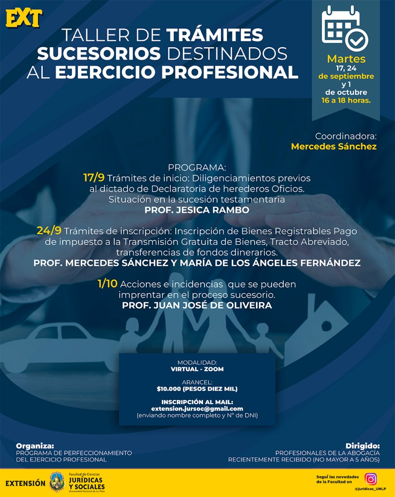 La Secretaria de Extensión Universitaria invita a participar del “TALLER DE TRÁMITES SUCESORIOS DESTINADOS AL EJERCICIO PROFESIONAL”, organizado por el Programa de Perfeccionamiento Del Ejercicio Profesional dependiente de ésta Secretaría, el cual se llevará a cabo los días martes 17, 24 de septiembre y 1 de octubre del corriente año de 16 a 18 hs., bajo modalidad virtual a través de la plataforma ZOOM.