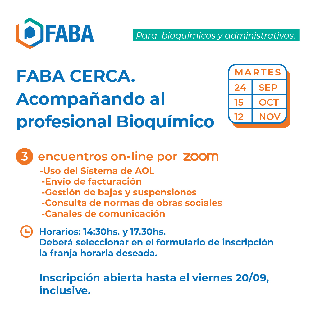 FABA CERCA: Invita a participar de 3 encuentros online pensados tanto para profesionales bioquímicos federados como para su personal administrativo de laboratorio. A lo largo de las charlas, abordaremos temas claves que ayudarán a optimizar tu gestión diaria: