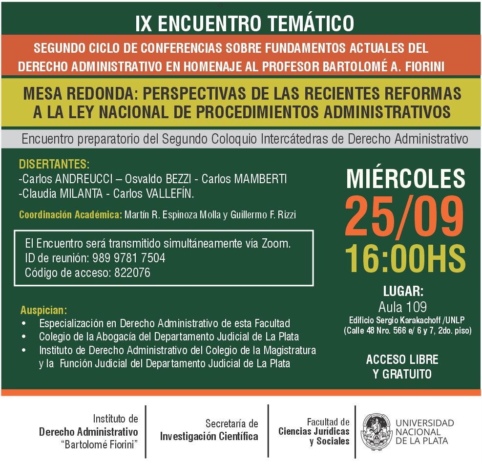 Este IX Encuentro, constituido como Mesa Redonda sobre Perspectivas de las recientes reformas a la Ley Nacional de Procedimientos Administrativos, se llevará a cabo el miércoles 25 de septiembre, a las 16 hs., de modo presencial en el Aula 109 del Edificio Sergio Karakachoff de la Universidad Nacional de La Plata (Calle 48 Nro. 566 e/ 6 y 7, 1er. piso); y será además transmitido simultáneamente vía Zoom.
