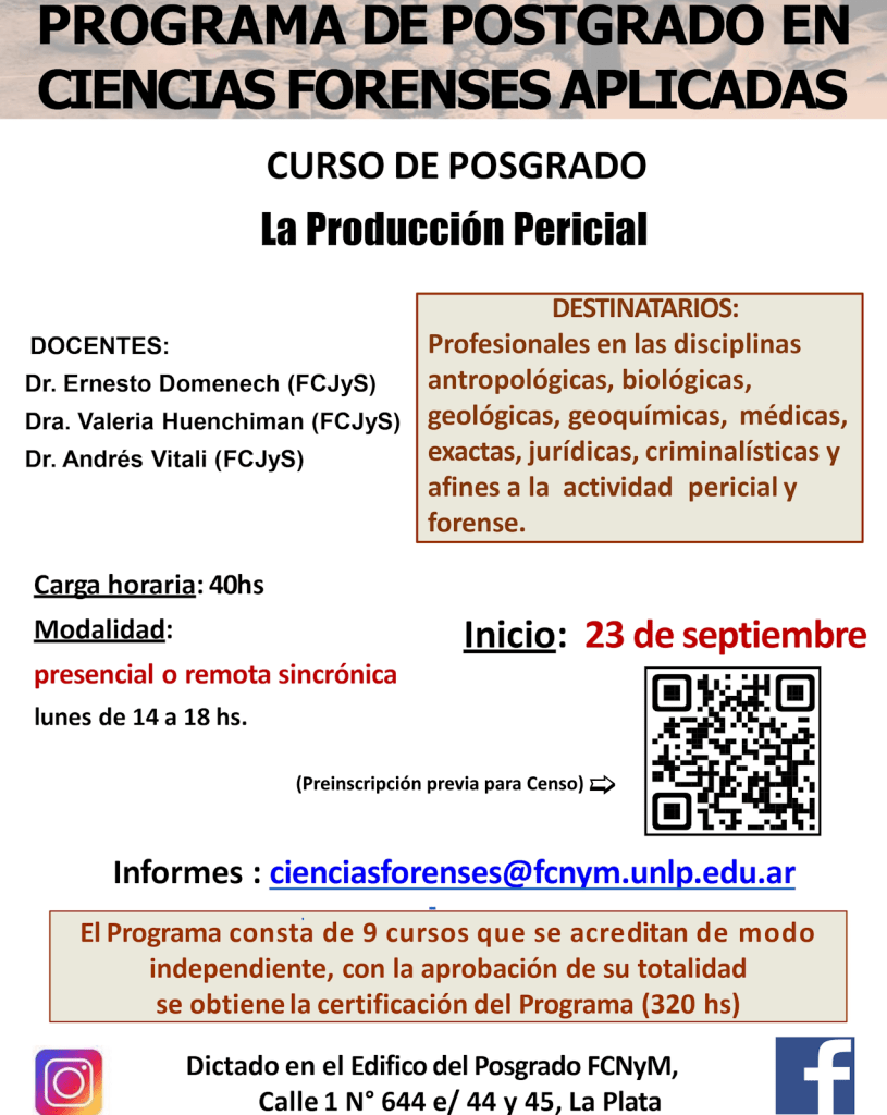 La Secretaría informa que ya se encuentra disponible la inscripción al Programa de Postgrado en Ciencias Forenses Aplicadas, organizado por la Facultad de Ciencias Jurídicas y Sociales y la Facultad de Ciencias Naturales y Museo. El mismo está formado por módulos independientes y se cursará, con modalidad Presencial, en la Facultad de Ciencias Naturales y Museo (Calle 1 N° 644 e/ 44 y 45, La Plata). La inscripción estará disponible mediante el sistema Siu Guaraní (de Posgrado) ˂CLICK AQUÍ˃