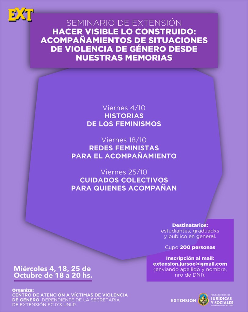 Los invitamos a participar del Seminario de extensión “Hacer visible lo construido: acompañamientos de situaciones de violencia de género desde nuestras memorias”, organizado por el Centro de Atención a Víctimas de Violencia de Género dependiente de la Secretaría de Extensión Universitaria de la FCJyS-UNLP.