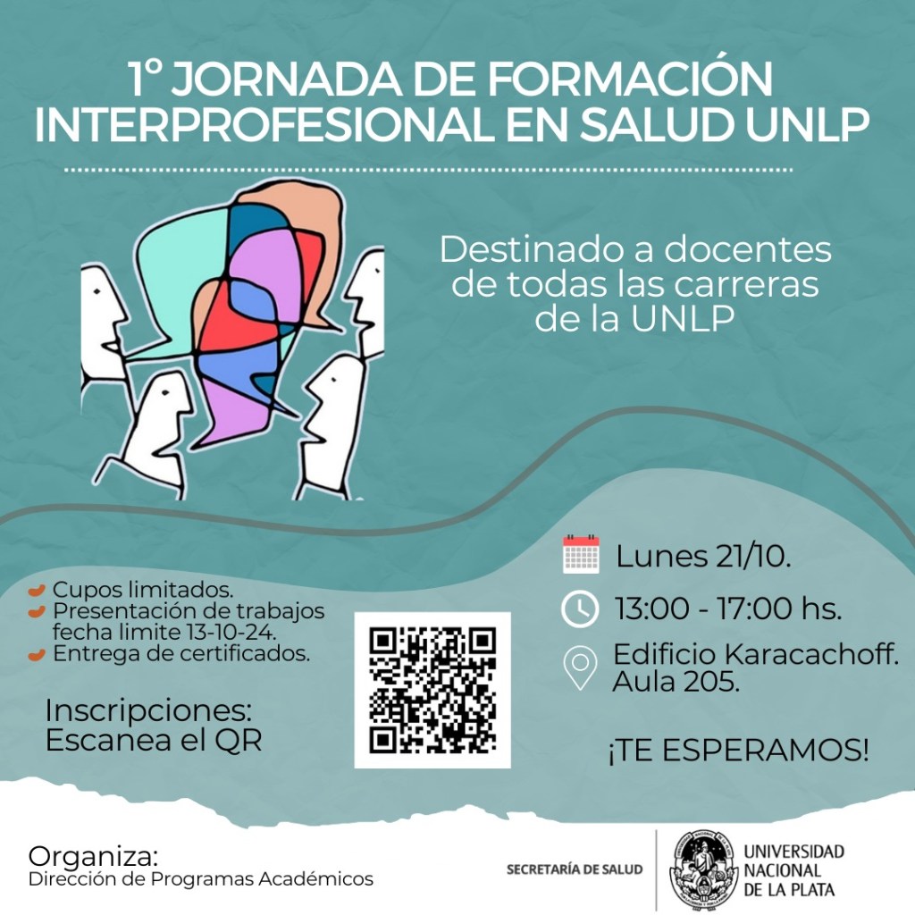 La Secretaría de Salud de la UNLP organiza la I Jornada de Formación Interprofesional en Salud, que se llevará a cabo el próximo 21 de octubre de 2024 en el Auditorio 205 del Edificio Karakachoff, desde las 12.30 hs hasta las 17 hs.