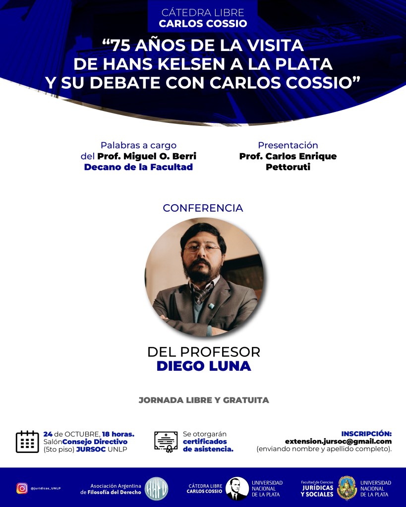 Los/as invitamos a participar de la jornada “75 años de la visita de Hans Kelsen a La Plata y su debate con Carlos Cossio”, organizada por la Cátedra libre “Carlos Cossio”, la Secretaría de Extensión Universitaria de la FCJyS-UNLP y auspiciada por la Asociación Argentina de Filosofía del Derecho, la cual se llevará a cabo el día jueves 24 de octubre a las 18 hs. en el Salón Consejo Directivo 5° piso, Edificio de la Reforma.