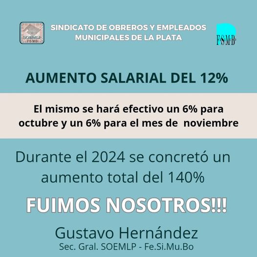 En lo que va del año los incrementos salariales alcanzan un 140%. A través de la priorización del diálogo permanente esperamos mejorar el salario de los y las trabajadoras municipales con la certeza de en poco tiempo lograr el objetivo de tener un salario digno, lejos de las negociaciones turbias que nos tenían acostumbrados la administración anterior y con la complicidad manifiesta de sectores que decían defender los derechos de los municipales platenses.