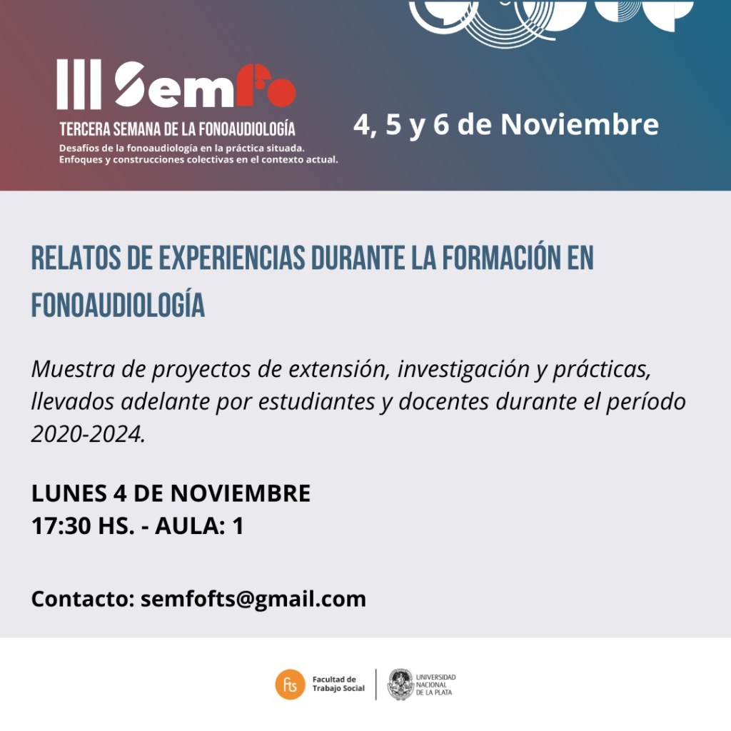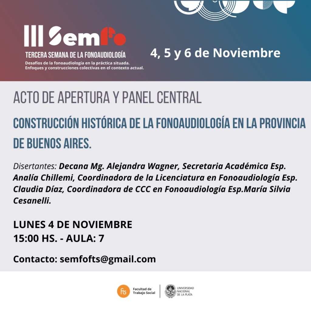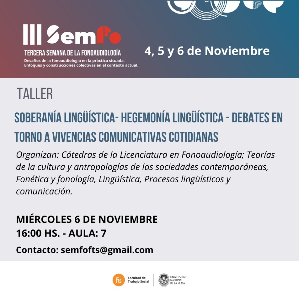 Los próximos lunes 4, martes 5 y miércoles 6 de noviembre se llevará a cabo la 𝗜𝗜𝗜 𝗦𝗲𝗺𝗮𝗻𝗮 𝗱𝗲 𝗹𝗮 𝗙𝗼𝗻𝗼𝗮𝘂𝗱𝗶𝗼𝗹𝗼𝗴í𝗮: «𝗗𝗲𝘀𝗮𝗳í𝗼𝘀 𝗱𝗲 𝗹𝗮 𝗙𝗼𝗻𝗼𝗮𝘂𝗱𝗶𝗼𝗹𝗼𝗴í𝗮 𝗲𝗻 𝗹𝗮 𝗣𝗿𝗮́𝗰𝘁𝗶𝗰𝗮 𝗦𝗶𝘁𝘂𝗮𝗱𝗮. 𝗘𝗻𝗳𝗼𝗾𝘂𝗲𝘀 𝘆 𝗰𝗼𝗯𝘀𝘁𝗿𝘂𝗰𝗰𝗶𝗼𝗻𝗲𝘀 𝗰𝗼𝗹𝗲𝗰𝘁𝗶𝘃𝗮𝘀 𝗲𝗻 𝗲𝗹 𝗰𝗼𝗻𝘁𝗲𝘅𝘁𝗼 𝗮𝗰𝘁𝘂𝗮𝗹.»