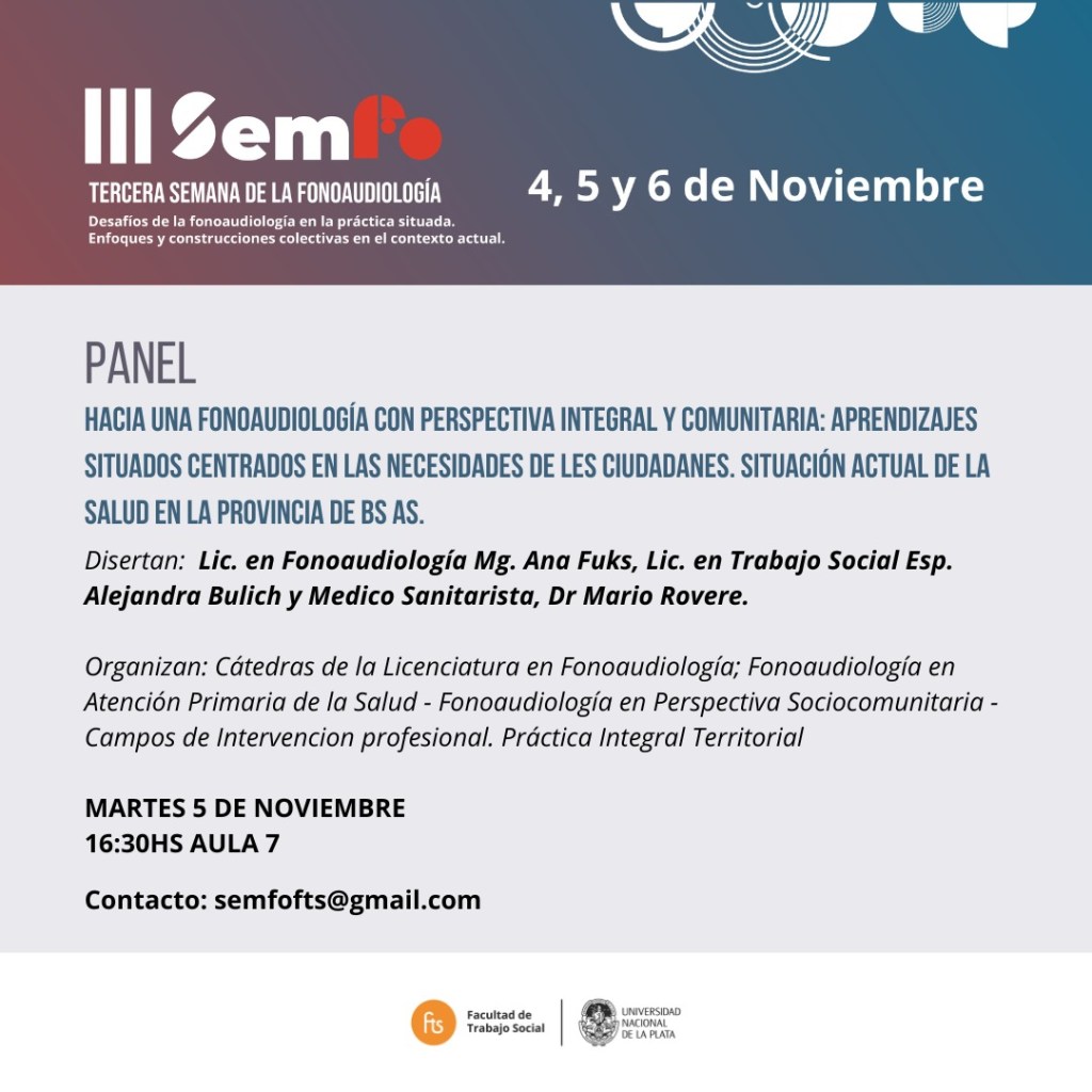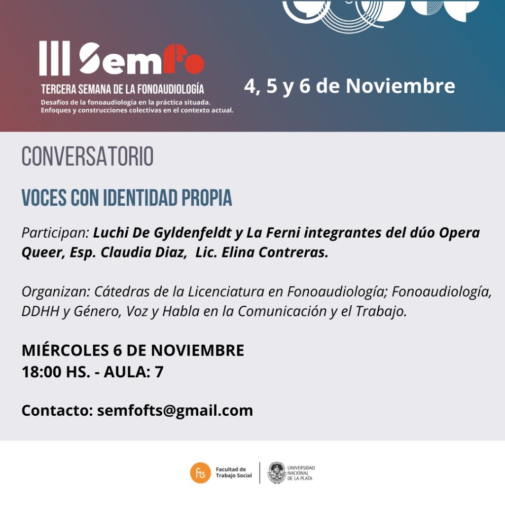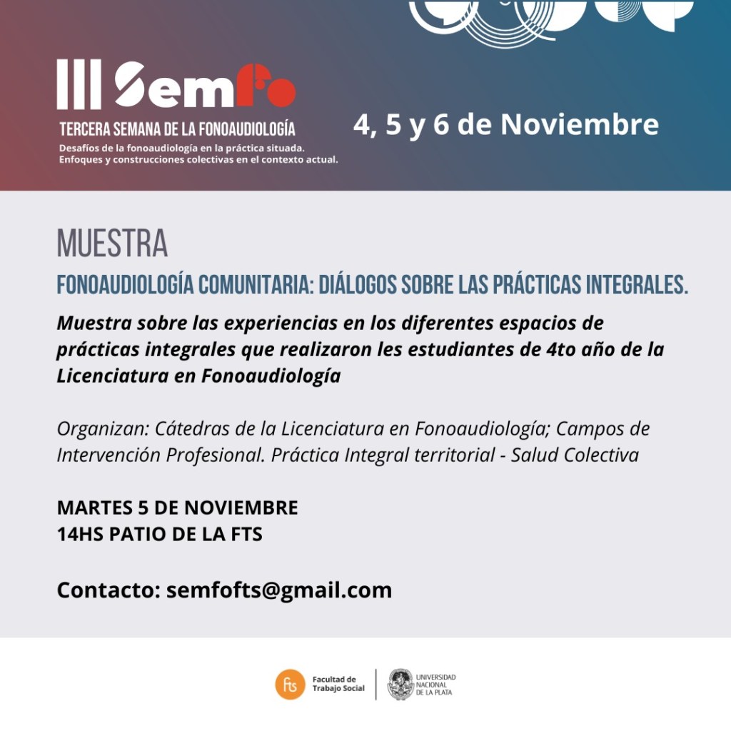 Los próximos lunes 4, martes 5 y miércoles 6 de noviembre se llevará a cabo la 𝗜𝗜𝗜 𝗦𝗲𝗺𝗮𝗻𝗮 𝗱𝗲 𝗹𝗮 𝗙𝗼𝗻𝗼𝗮𝘂𝗱𝗶𝗼𝗹𝗼𝗴í𝗮: «𝗗𝗲𝘀𝗮𝗳í𝗼𝘀 𝗱𝗲 𝗹𝗮 𝗙𝗼𝗻𝗼𝗮𝘂𝗱𝗶𝗼𝗹𝗼𝗴í𝗮 𝗲𝗻 𝗹𝗮 𝗣𝗿𝗮́𝗰𝘁𝗶𝗰𝗮 𝗦𝗶𝘁𝘂𝗮𝗱𝗮. 𝗘𝗻𝗳𝗼𝗾𝘂𝗲𝘀 𝘆 𝗰𝗼𝗯𝘀𝘁𝗿𝘂𝗰𝗰𝗶𝗼𝗻𝗲𝘀 𝗰𝗼𝗹𝗲𝗰𝘁𝗶𝘃𝗮𝘀 𝗲𝗻 𝗲𝗹 𝗰𝗼𝗻𝘁𝗲𝘅𝘁𝗼 𝗮𝗰𝘁𝘂𝗮𝗹.»