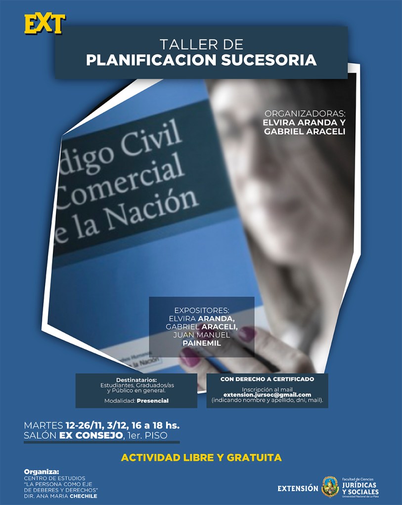 La Secretaría de Extensión Universitaria invita a participar del «Taller de planificación sucesoria” organizado por el Centro de Estudios “La persona como eje de deberes y derechos”, el cual se llevará a cabo de manera presencial los martes 12 y 26 de noviembre, y 3 de diciembre de 16 a 18 hs. en el Salón Ex Consejo Directivo (1º piso, pasillo de Secretaría de Extensión).