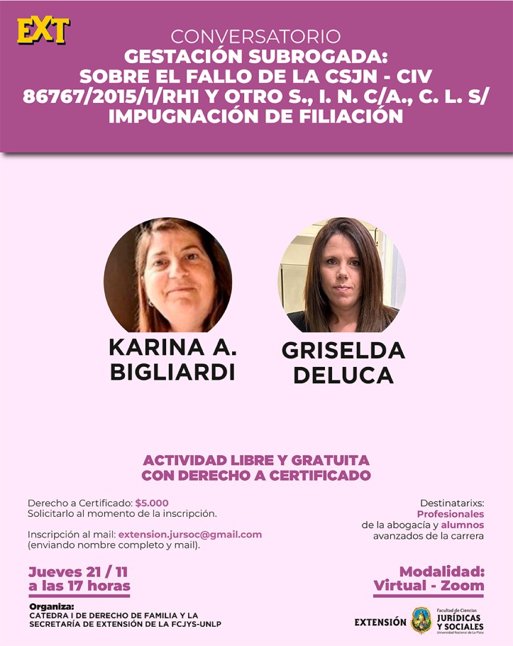 La Secretaria de Extensión Universitaria invita a participar del Conversatorio «GESTACIÓN SUBROGADA:SOBRE EL FALLO DE LA CSJN – CIV 86767/2015/1/RH1 Y OTRO S., I. N. C/A., C. L. S/ IMPUGNACIÓN DE FILIACIÓN”, organizado por la Catedra I de Derecho de Familia y la Secretaría de Extensión de la FCJyS-UNLP, el cual se llevará a cabo el día jueves 21 de noviembre del corriente año de 17 a 19 hs., bajo modalidad virtual a través de la plataforma ZOOM.