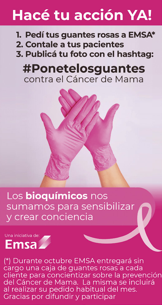 Cada laboratorio cliente de Emsa recibió guantes de color rosa, símbolo de la lucha contra el cáncer de mama, para distribuirlos entre sus empleados y difundir el mensaje de prevención. Estos guantes, además de ser un insumo esencial en la labor diaria de los profesionales bioquímicos, sirvieron como recordatorio constante de la importancia de la autoexploración, los controles médicos regulares y el seguimiento de estudios pertinentes, pilares fundamentales en la detección precoz de esta enfermedad.