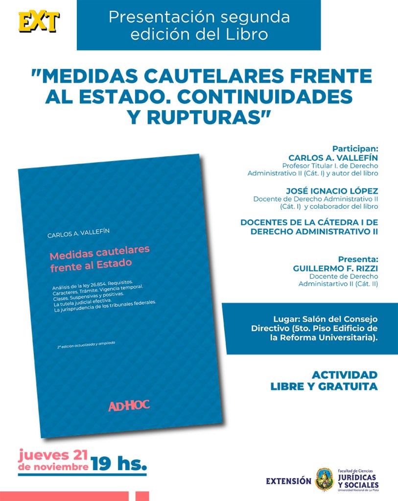 La Secretaria de Extensión Universitaria invita a participar de la Presentación de la segunda edición del libro «MEDIDAS CAUTELARES FRENTE AL ESTADO. CONTINUIDADES Y RUPTURAS», organizada la Secretaría de Extensión Universitaria, la cual se llevará a cabo bajo presencial, el día jueves 21 de noviembre del corriente año a las 19 hs. en el Salón del Consejo directivo (5to. Piso Edificio de la Reforma Universitaria).