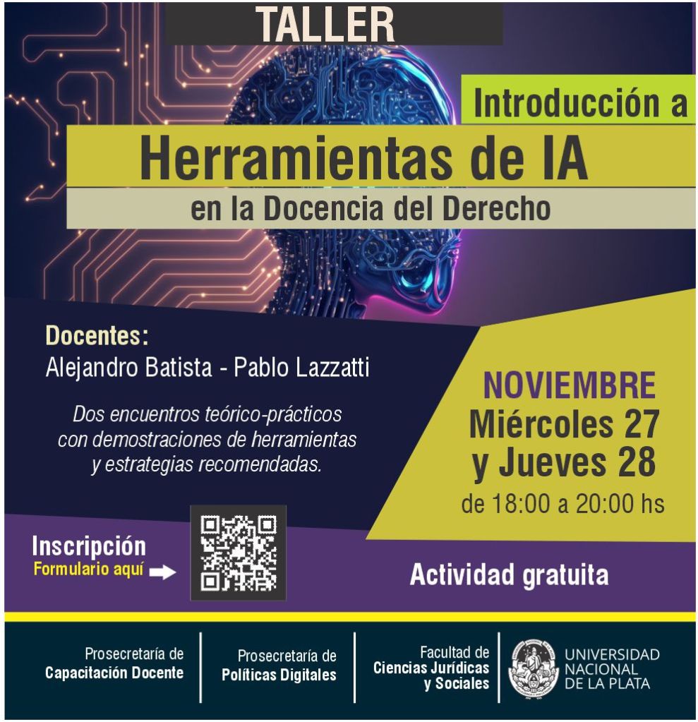 Los días miércoles 27 y jueves 28 de noviembre de 2024 a las 18hs, se llevará a cabo un Taller sobre Herramientas de IA para Docentes.
