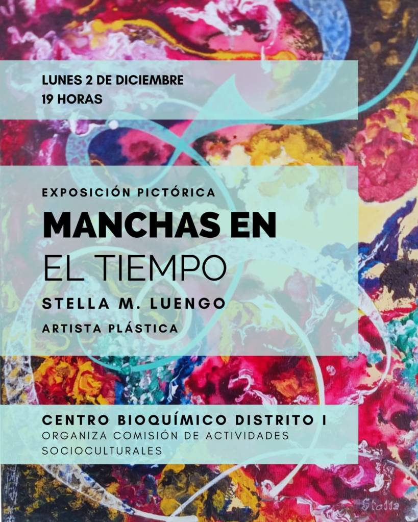 El próximo lunes 2 de diciembre, a las 19 horas, será inaugurada la exposición pictórica «Manchas en el Tiempo» de la artista plática Stella M. Luengo, en hall de entrada del Centro Bioquímico – Distrito I, ubicado en Avenida 44 N° 470.