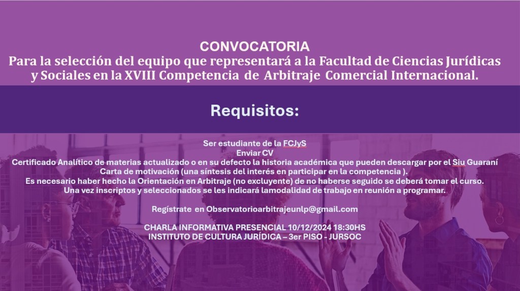 Tenemos el agrado de invitarlos a la convocatoria para la selección del equipo de estudiantes que representará a la Facultad de Ciencias Jurídicas y Sociales de la Universidad Nacional de La Plata, en la XVIII edición de la Competencia Internacional de Arbitraje.