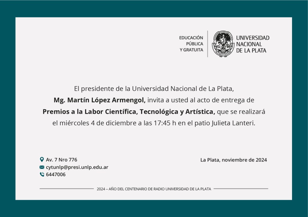 La Secretaría de Investigación Científica invita a participar del acto de entrega de Premios a la Labor Científica, Tecnológica y Artística que se realizará el miércoles 4 de diciembre a las 17:45hs en el Patio Julieta Lanteri del Rectorado.