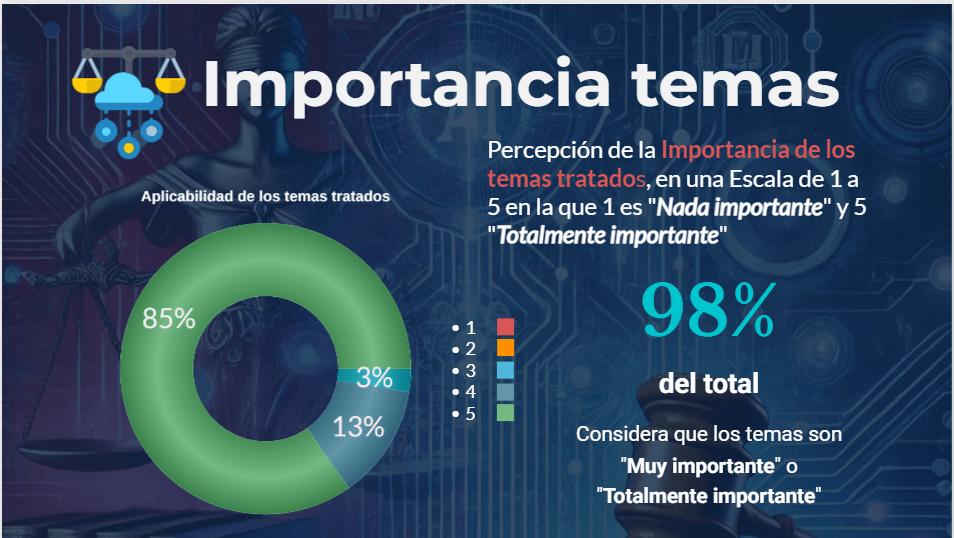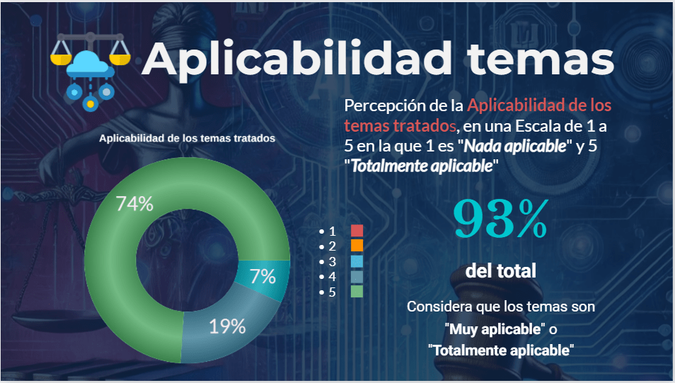 Los datos que surgen de la Encuesta anónima que respondieron los participantes, surge la ineludible Importancia de los temas tratados ya que el 98% consideró «Muy importante o Totalmente importante» lo visto en las clases, su Aplicabilidad con un 93% que consideró lo visto como «Muy aplicable o Totalmente aplicable», así como la Claridad de las clases con un 99% de satisfacción en este aspecto y marcando además con un 96% de respuestas positivas la necesidad de oferta de Posgrado en la temática.