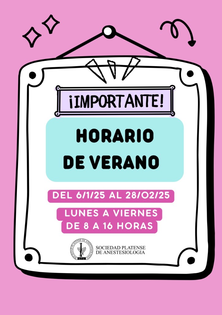 Desde el lunes 6 de enero y hasta el próximo 28 de febrero la Sociedad Platense de Anestesiología tendrá horario de verano: de lunes a viernes de 8 a 16.