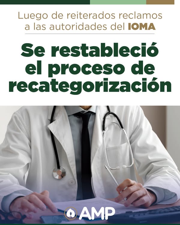En el marco de las reiteradas reuniones mantenidas con las autoridades del IOMA -sumado al constante reclamo de la Agremiación Médica Platense desde hace muchos meses- se ha logrado restablecer la regularización del proceso de recategorizaciones pendientes, el cual se terminará de efectivizar en los próximos días.