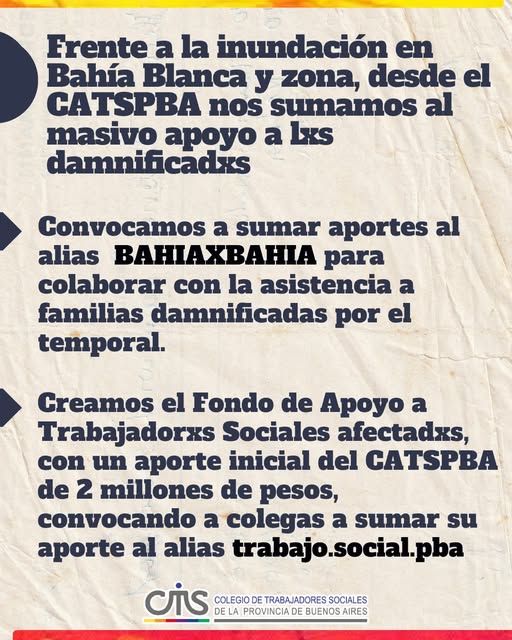 Desde el Colegio de Trabajadorxs Sociales de la Provincia de Buenos Aires, nos sumamos al masivo apoyo a lxs daminificadxs por las inundaciones en Bahía Blanca y ciudades cercanas.