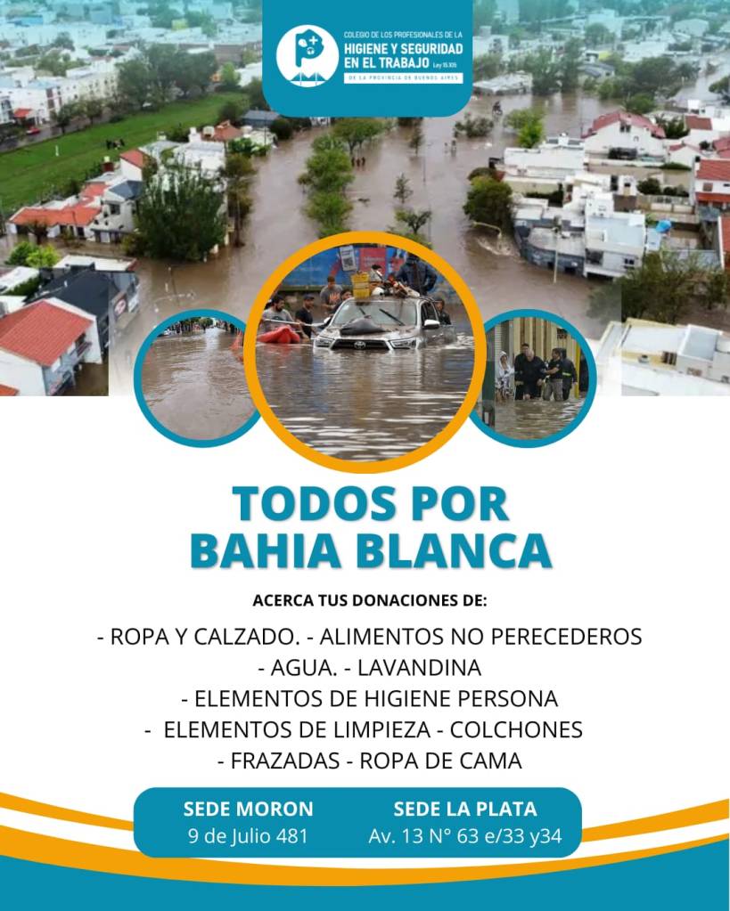 Los profesionales bonaerenses de la Higiene y Seguridad nos unimos para ayudar a los afectados por las inundaciones en Bahía Blanca. Es momento de colaborar y brindar apoyo a quienes más lo necesitan.