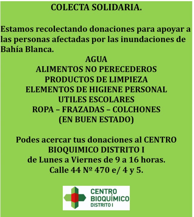 El Distrito 1 lanzó una colecta solidaria con el objetivo de brindar apoyo a la población de Bahía Blanca, que enfrenta las consecuencias de las inundaciones que afectaron a la región. Esta iniciativa surge como una respuesta empática a la adversidad que alguna vez vivimos en la ciudad de La Plata, y ahora es el momento de devolver la mano.