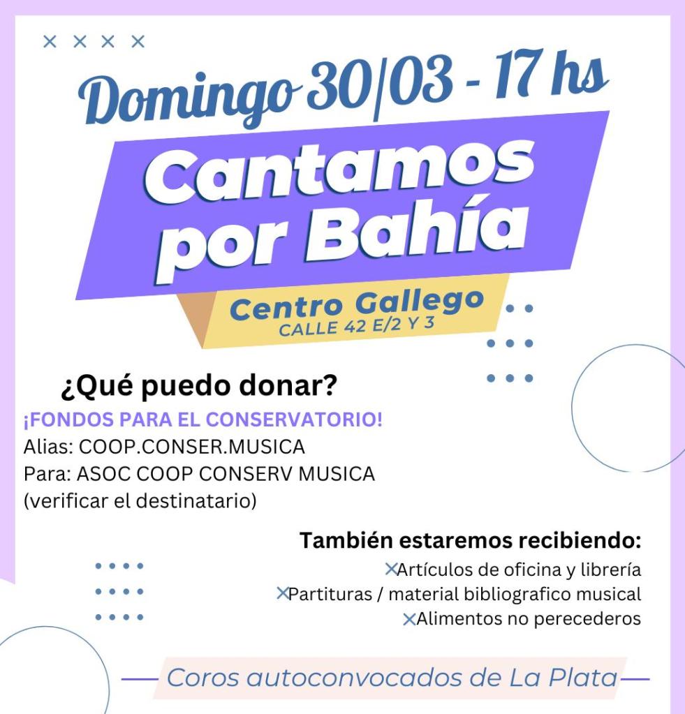 «Cantemos por Bahía», tendrá lugar el próximo domingo 30 de marzo desde las 17 hs., en el Centro Gallego de 42, e/ 2 y 3.