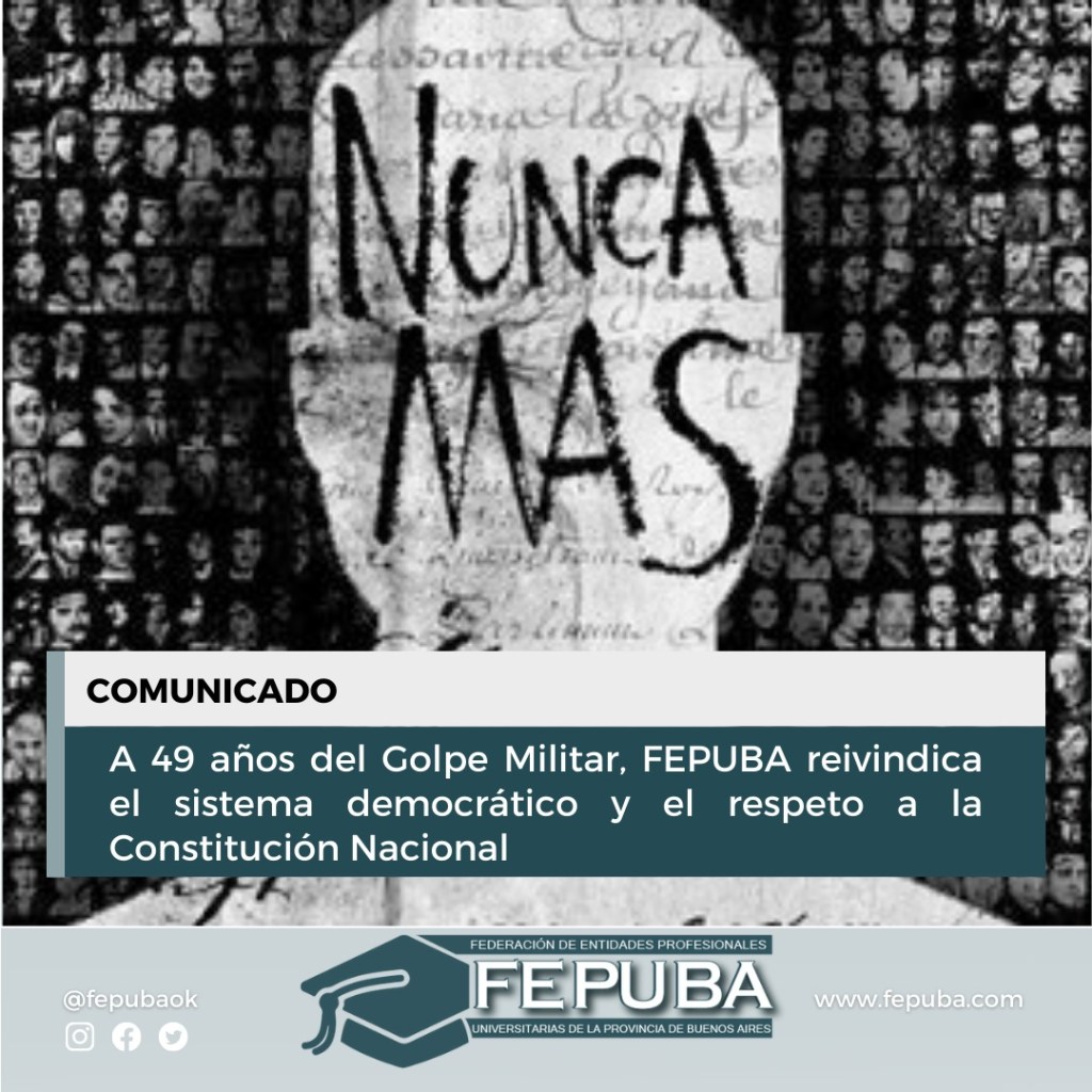 En este 24 de marzo en que se cumplen 49 años del golpe cívico-militar que marcó la etapa más siniestra y dolorosa de la República Argentina, la Federación de Entidades Profesionales Universitarias de la Provincia de Buenos Aires, hace un llamado a la reflexión para poner en relieve el valor de la democracia y sus instituciones, como así también al diálogo, el respeto por el disenso, y la búsqueda del consenso, como la única vía posible para lograr la paz, y el progreso sostenible, sustentable y equilibrado.