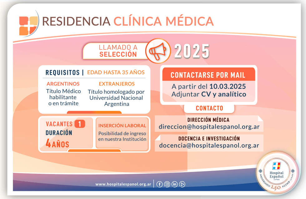 El Colegio de Médicos Distrito I informa que se encuentra abierto un nuevo llamado a Selección para un cargo para las Residencias de Clínica Médica y Clínica Quirúrgica del Hospital Español de La Plata.