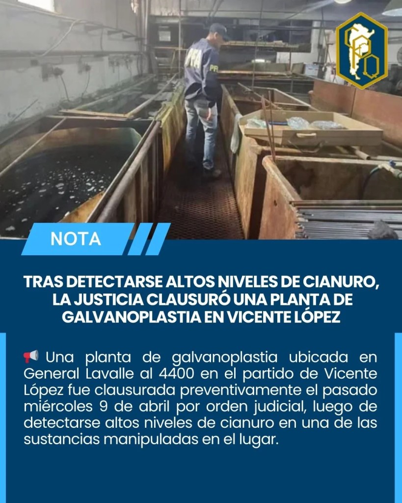 Una planta de galvanoplastia ubicada en General Lavalle al 4400 en el partido de Vicente López fue clausurada preventivamente el pasado miércoles 9 de abril por orden judicial, luego de detectarse altos niveles de cianuro en una de las sustancias manipuladas en el lugar.