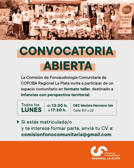 La Comisión de Fonoaudiología Comunitaria del Colegio de Fonoaudiólogos de la Provincia de Buenos Aires (COFOBA) Regional La Plata abrió una convocatoria destinada a profesionales matriculados interesados en sumarse a un espacio de comunitario en formato de taller, destinado a infancias con perspectiva territorial.