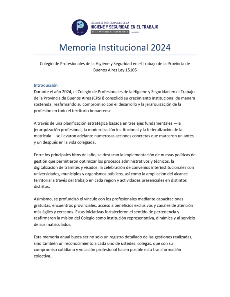 En la ciudad de La Plata, con la presencia de matriculados y miembros de Comisión Directiva se realizó la Asamblea Anual Ordinaria del Colegio en la que se dio tratamiento a la Memoria y Balance del periodo 2024. “La gestión 2024 del Colegio de Profesionales de la Higiene y Seguridad en el Trabajo de la Provincia de Buenos Aires dejó huella en la consolidación institucional, en la profesionalización del ejercicio, y en la ampliación efectiva de derechos y beneficios para nuestros matriculados” expresó el Lic. Lorenzo Gómez, Presidente del Colegio.