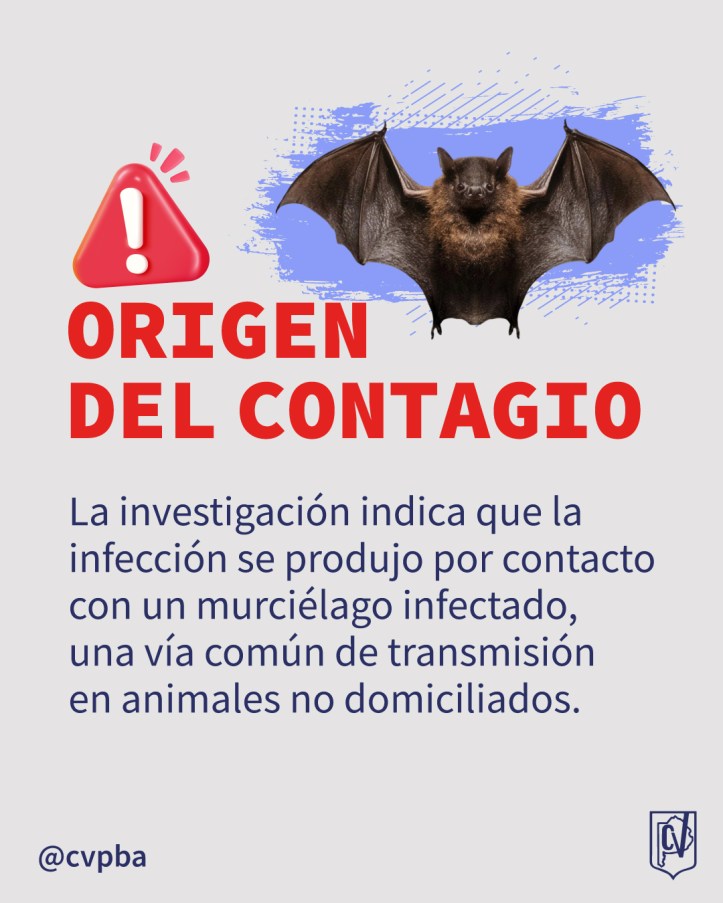 El animal involucrado, un gato joven, amarillo, sin castrar ni identificar, se presume contrajo la rabia al cazar un murciélago infectado, forma común de contagio en felinos no domiciliados.