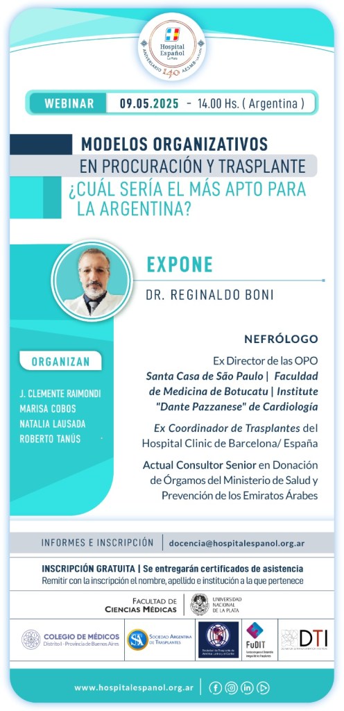 Se realiza el viernes 9 de mayo, invita la Cátedra de Trasplante de Órganos, Tejidos y Células.