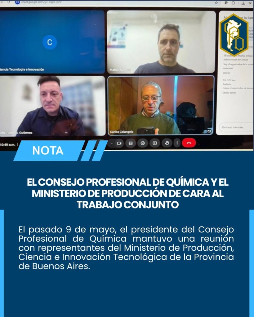 El pasado 9 de mayo, el presidente del Consejo Profesional de Química mantuvo una reunión con representantes del Ministerio de Producción, Ciencia e Innovación Tecnológica de la Provincia de Buenos Aires.