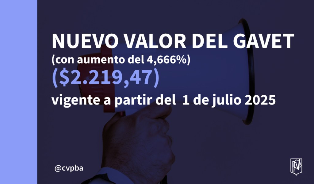 El CVPBA pone en conocimiento de los matriculados que el Consejo Directivo, a través de la RESOLUCIÓN N196 resolvió fijar el valor del GAVET en la suma de $2.120,53 con vigencia a partir del 1 de julio 2025.