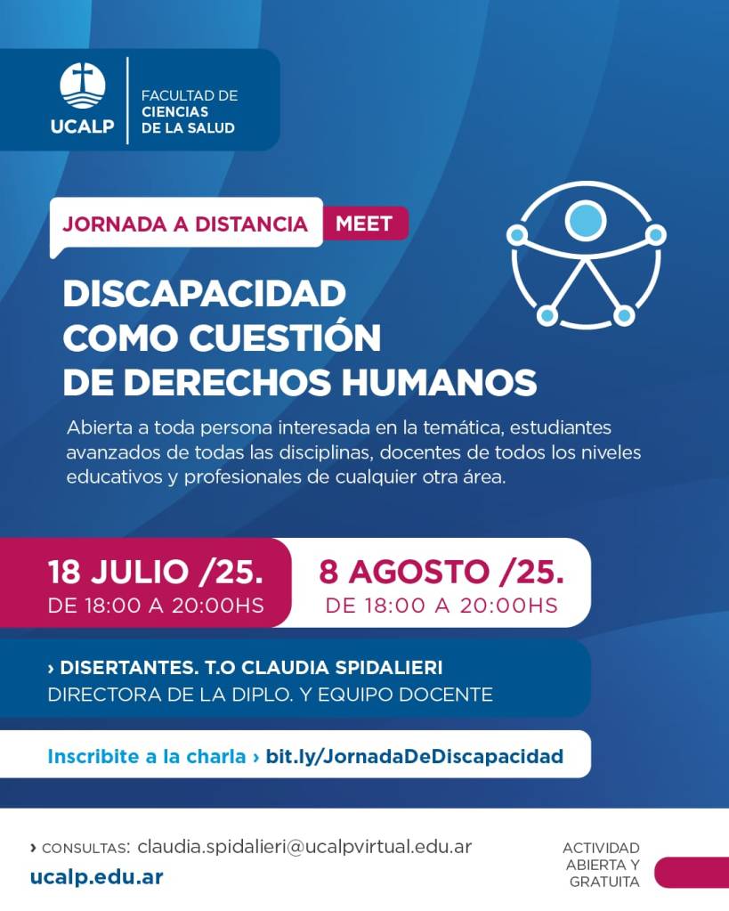 La T.O Claudia Spidalieri, será la disertante en la Jornada a Distancia «Discapacidad como cuestión de Derechos Humanos», convocada por la Facultad de Ciencias de la Salud de la UCALP.