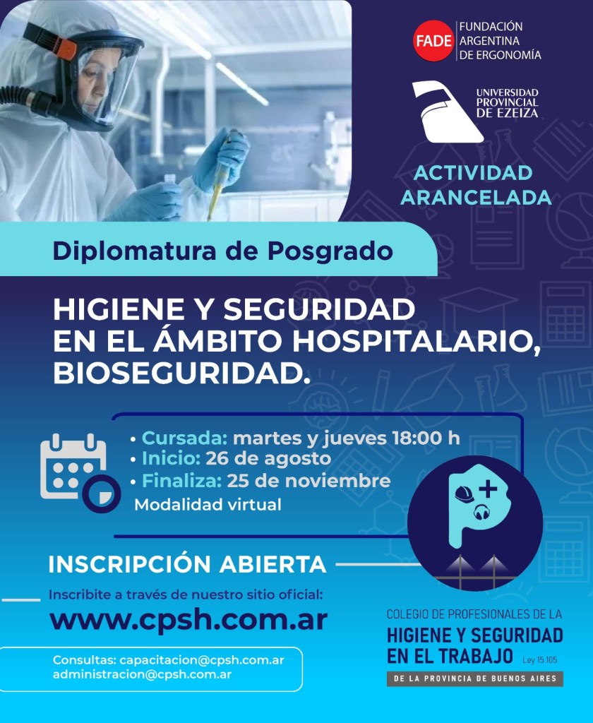 La Universidad Provincial de Ezeiza en conjunto con el Colegio de Profesionales de Higiene y Seguridad de la Provincia de Buenos Aires tienen una nueva cohorte abierta para la Diplomatura de Posgrado en Higiene y Seguridad en el Ámbito Hospitalario y Bioseguridad.