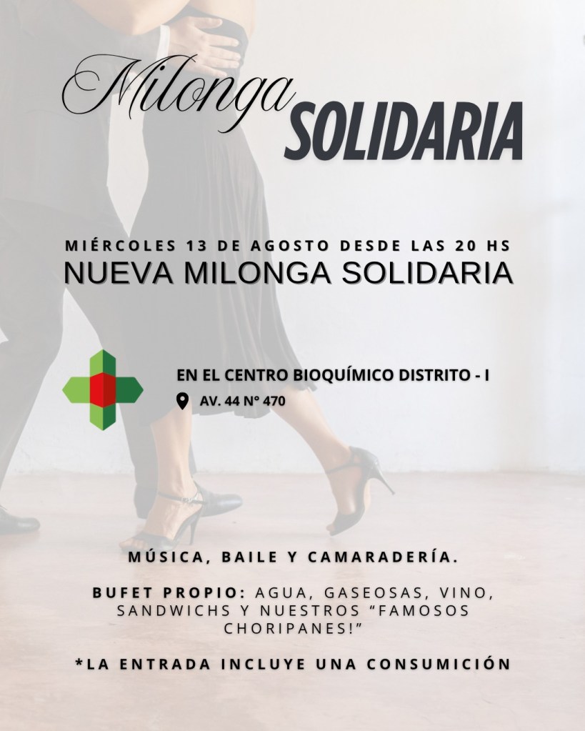 El próximo miércoles 13 de agosto, a partir de las 20 hs, tendrá lugar una nueva encuentro de la tradicional Milonga Solidaria del Centro Bioquímico Distrito I, en la sede institucional de Av. 44 N° 470 .