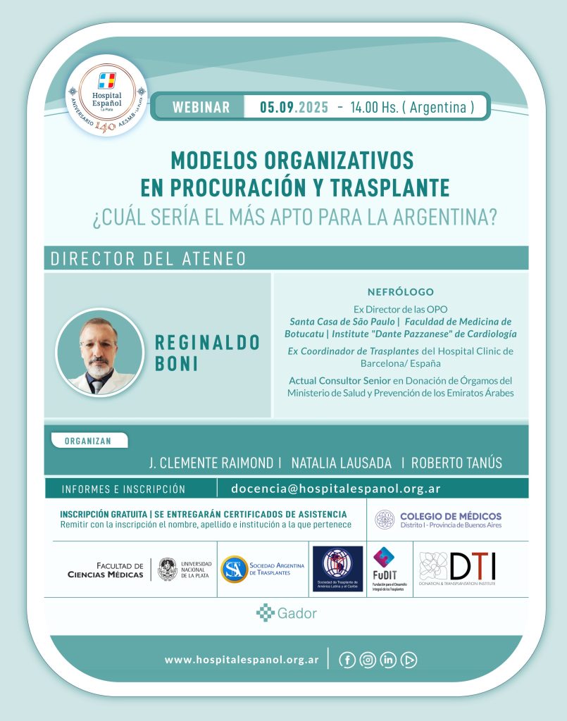 El Colegio de Médicos de la Provincia de Buenos Aires, Distrito I, informa a sus matriculados que el próximo 5 de septiembre a las 14 hs se realizará el Webinar: Modelos Organizativos en Procuración y Trasplante.