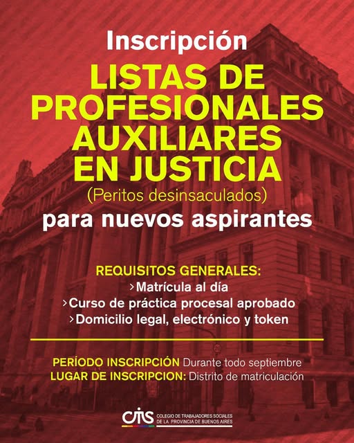 Como todos los años, desde el primer al último día hábil de septiembre se realiza en los Colegios Profesionales la inscripción de Peritos desinsaculados para desempeñarse como auxiliares de la justicia el año próximo (Acuerdo 2728/ modif Acuerdo 3229/05 de la SCJPBA).
