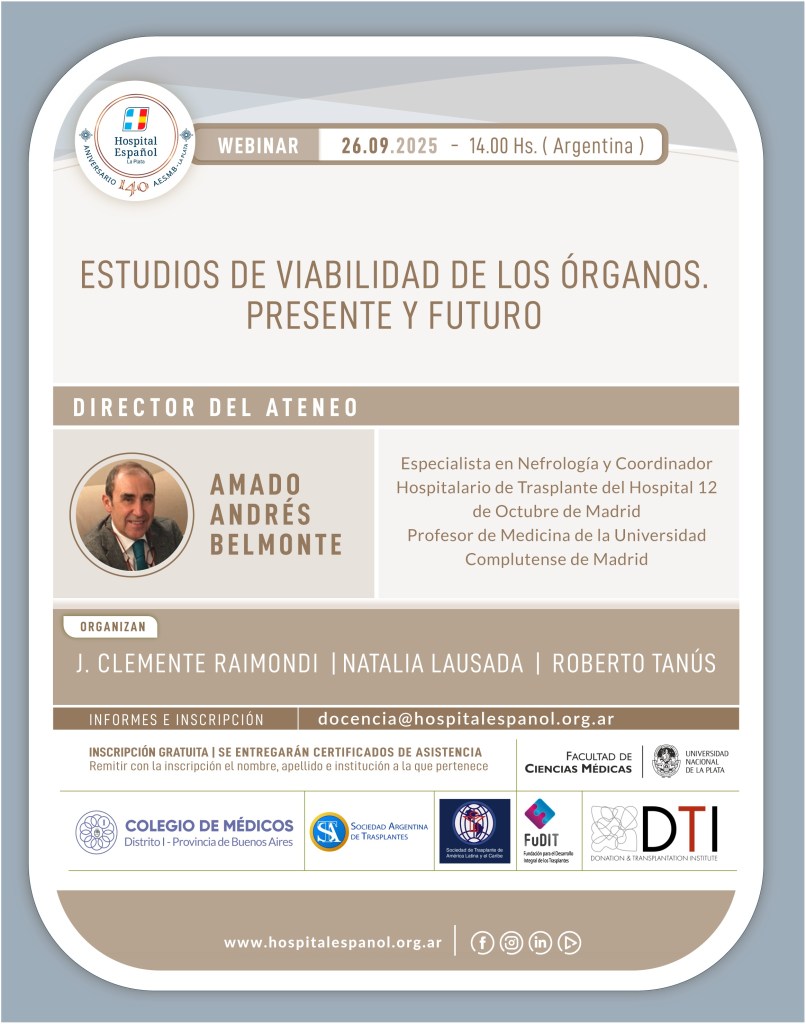 Este viernes 26 de septiembre a las 14:00 hs, se realizará el webinar titulado “Estudios de viabilidad de los órganos. Presente y futuro”. El mismo estará a cargo del Prof. Dr. Amado Andrés Belmonte, Especialista en Nefrología y Coordinador Hospitalario de Trasplante del Hospital 12 de Octubre de Madrid, y Profesor de Medicina de la Universidad Complutense de Madrid.