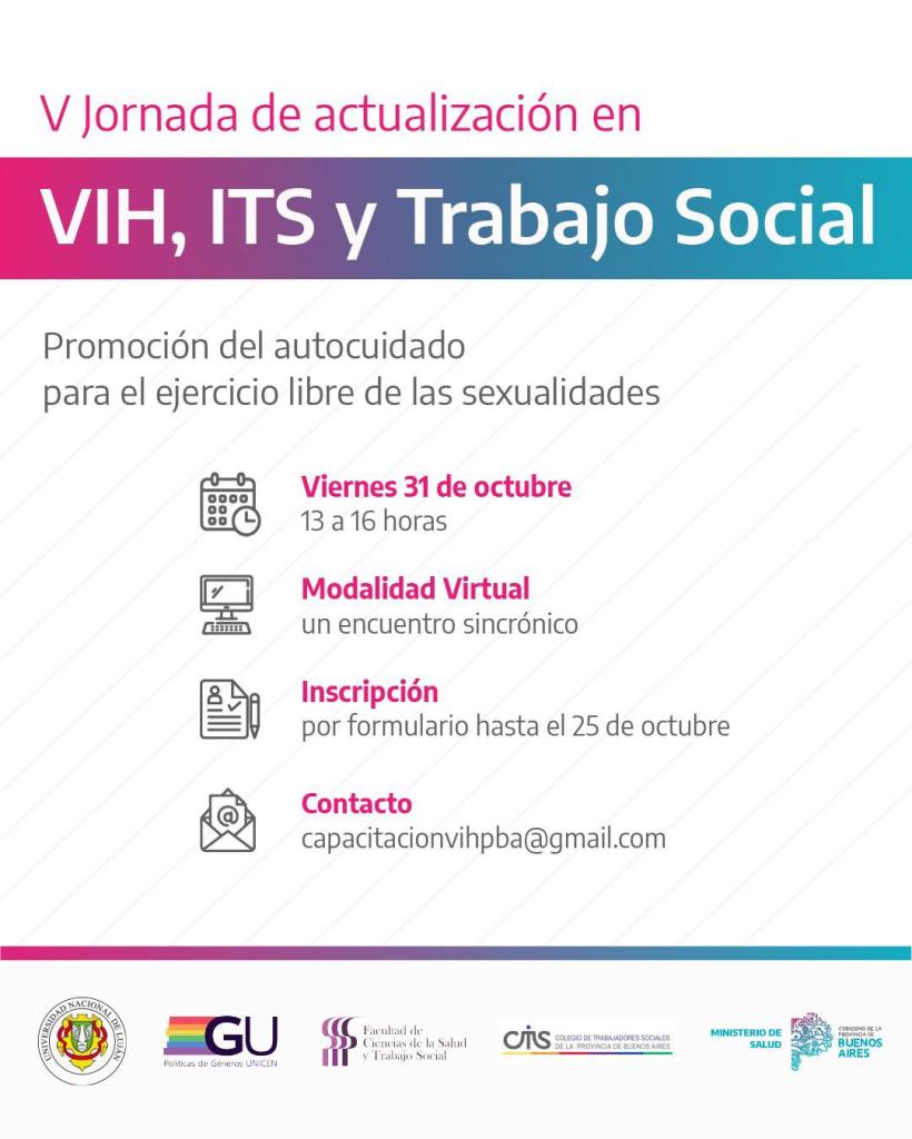 *Inscripción abierta a la V Jornada de Actualización en VIH, ITS y Trabajo Social “Promoción del autocuidado para el ejercicio libre de las sexualidades” hasta el 25/10 acá:*