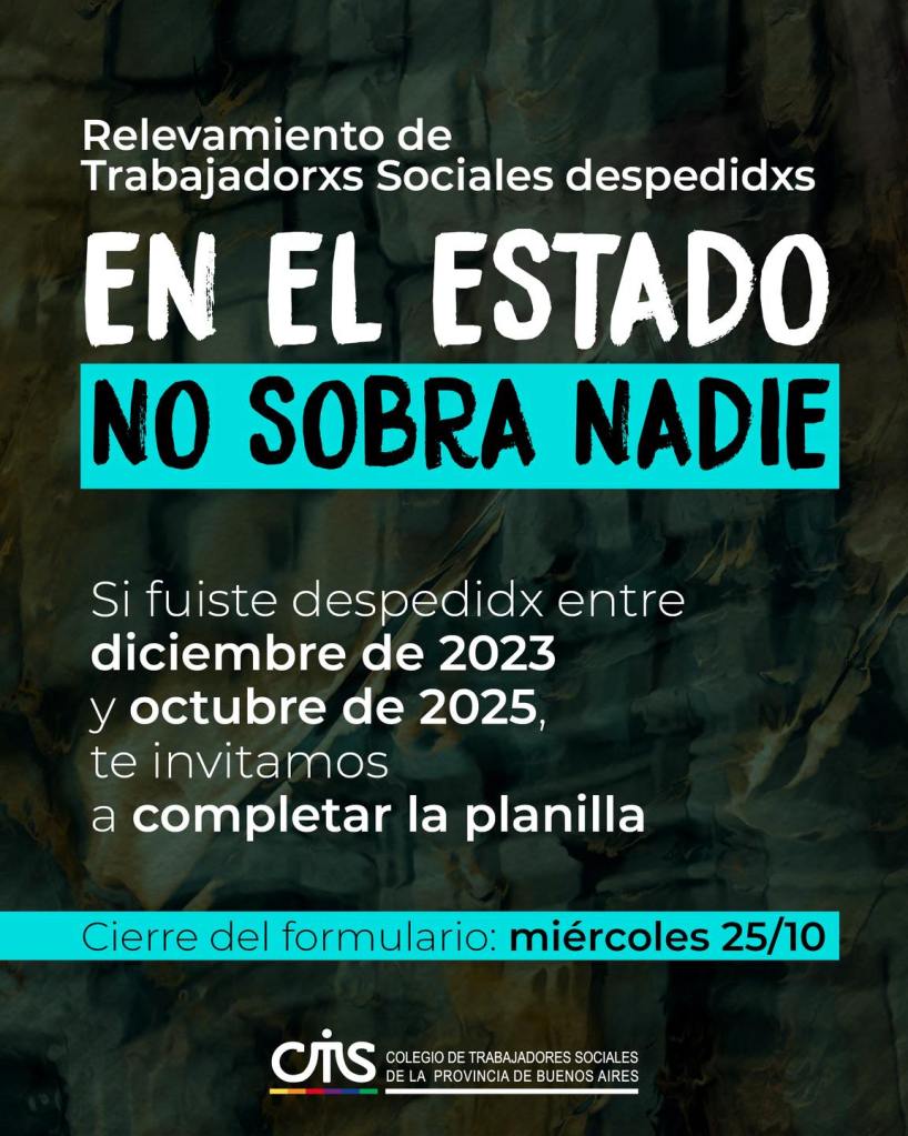 Relevamiento de Trabajadorxs Sociales de provincia de Buenos Aires despedidxs de Ministerios, organismos nacionales u organizaciones sociales convenidas con organismos nacionales. Si fuiste despedidx entre diciembre de 2023 y octubre de 2025, te invitamos a completar la planilla