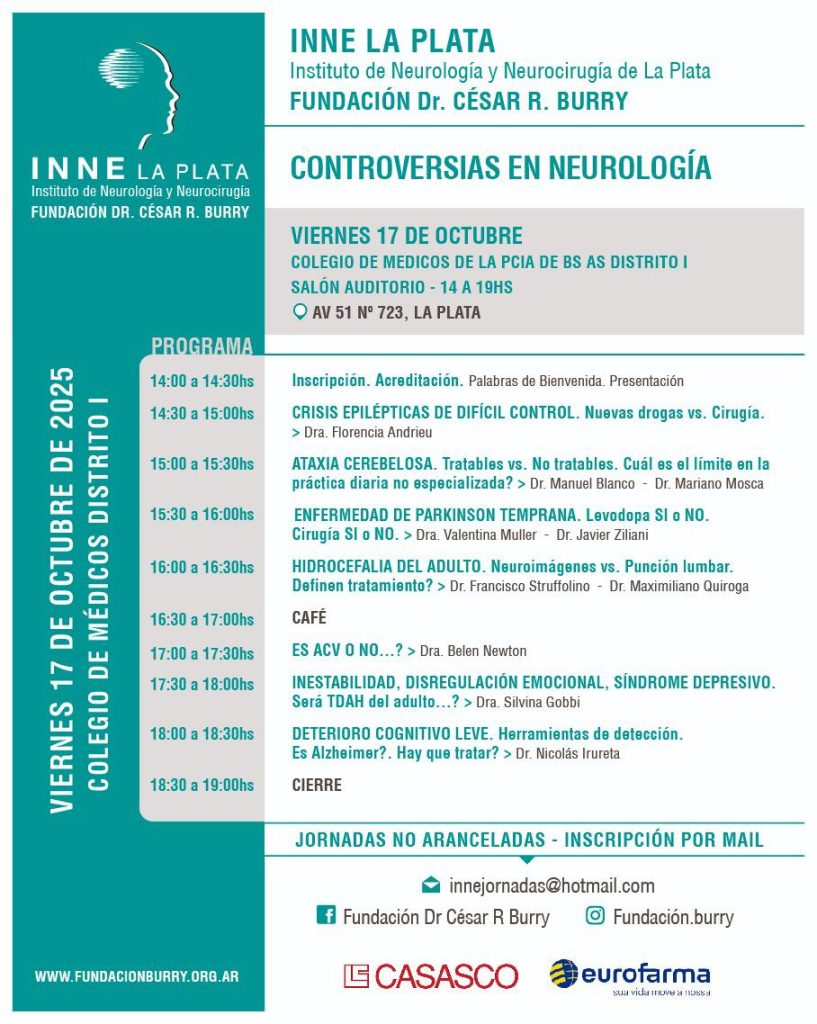 El Colegio de Médicos de la Provincia de Buenos Aires, Distrito I, informa a sus matriculados que el Instituto de Neurología y Neurocirugía de La Plata, realizará las jornadas sobre Controversias en Neurología. la actividad tendrá lugar el 17 de octubre de 14 a 19 hs.